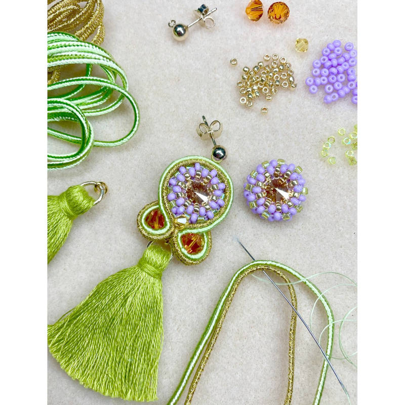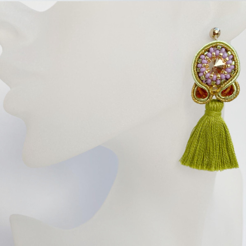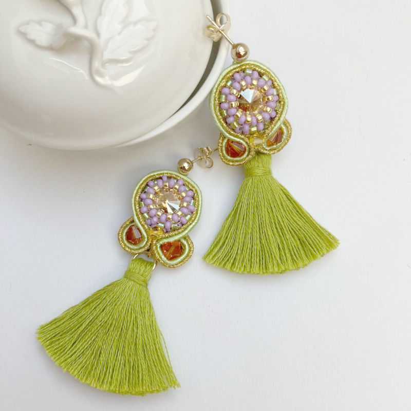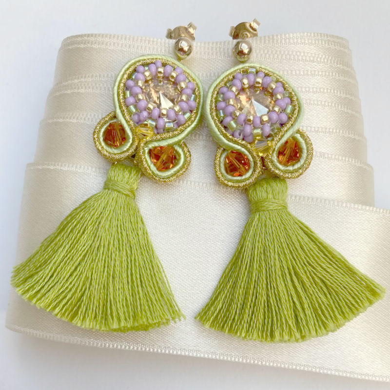 Diese zauberhaften Soutache-Ohrhänger sind ein kleiner, seidiger Traum in frischen Farben. Wir haben sie selbst von Hand gefertigt, in einer aufwendigen, raffinierten Technik. Dabei wurden feine Soutache-Litzen in Grün-und Goldtönen um ein funkelndes Kristall genäht, das vorher noch mit kleinsten Perlchen dekorativ umrandet wurde. Blickfang ist die Quaste in hellem Lime-Grün, die frei am Ohrring baumelt. Die Rückseite ist mit farblich passendem, weichem Kunstleder versäubert.