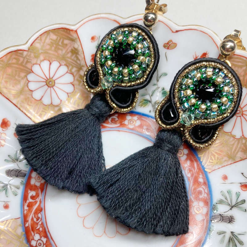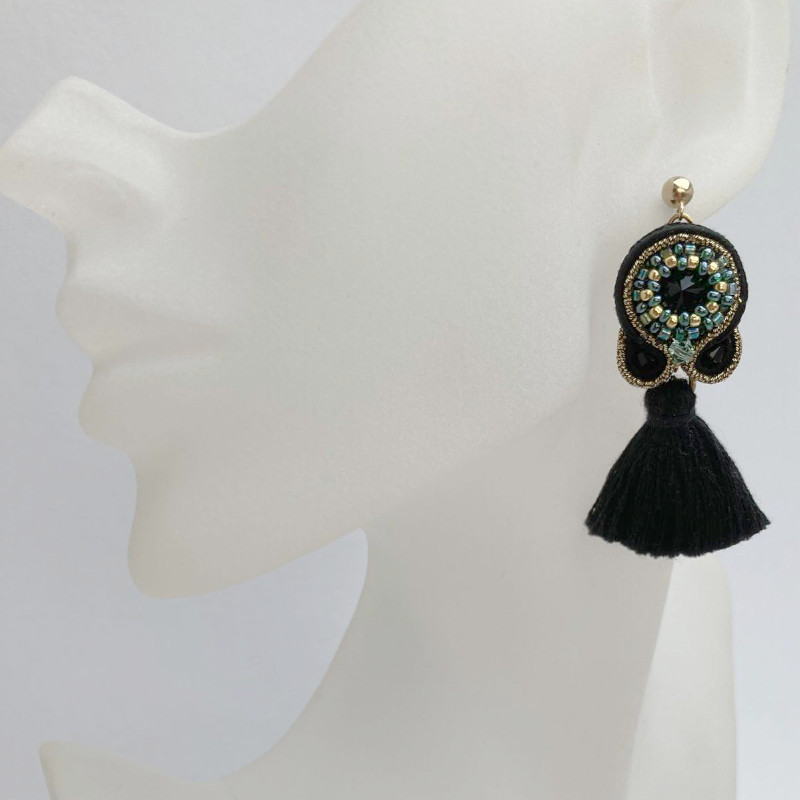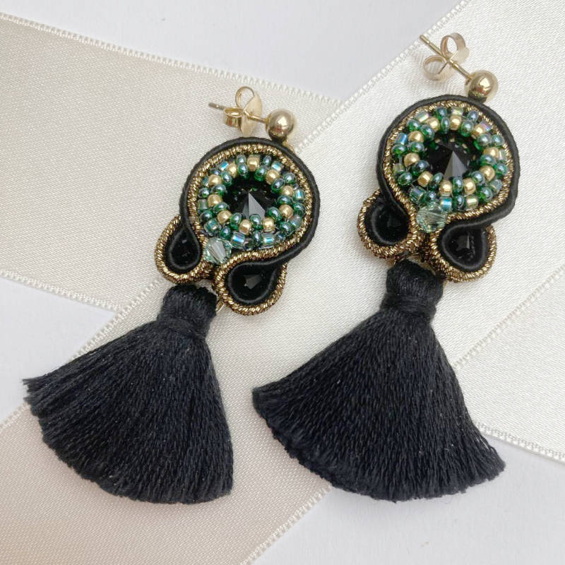 Höchst raffiniert und elegant sind diese schwarzen Soutache-Ohrringe. Wir haben sie selbst von Hand gefertigt, in einer aufwendigen, raffinierten Technik. Dabei wurden feine Soutache-Litzen in Schwarz-und Gold um ein funkelndes Kristall genäht, das vorher noch mit kleinsten Perlchen dekorativ umrandet wurde. Blickfang ist die Quaste in Schwarz, die frei am Ohrring baumelt. Die Rückseite ist mit farblich passendem, weichem Kunstleder versäubert.